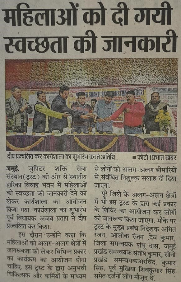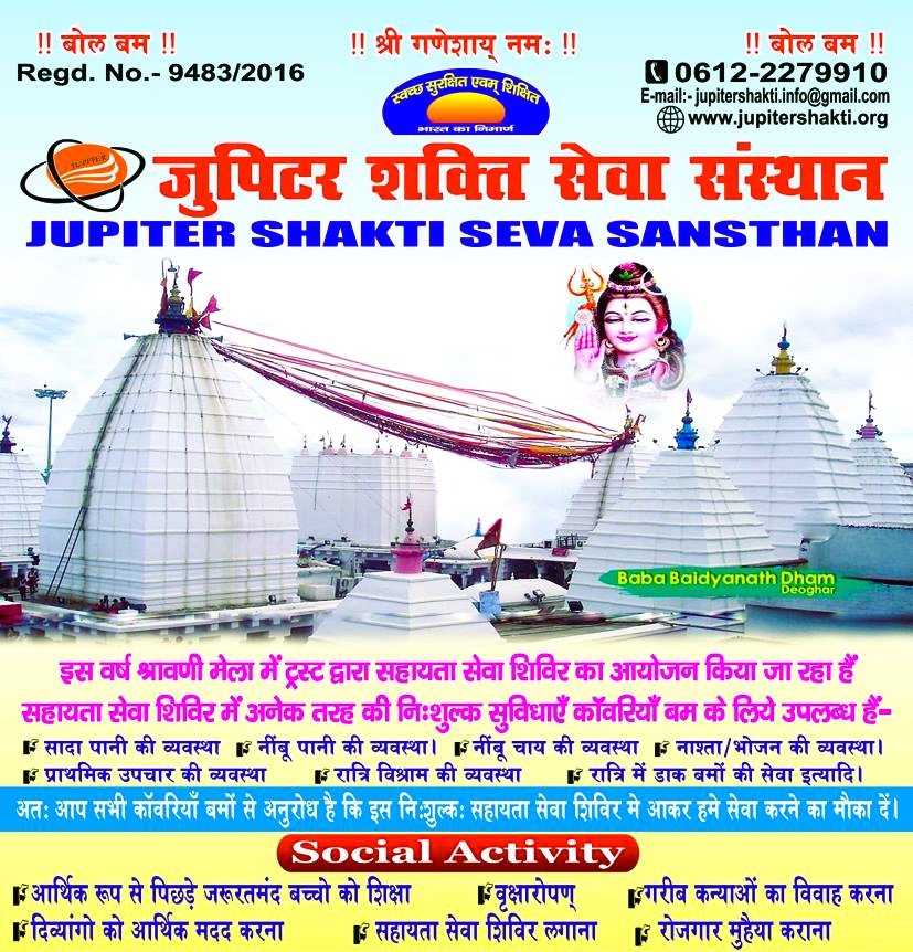 जुपिटर शक्ति सेवा संस्थान भारत सरकार के नियमानुसार एक रजिस्टर्ड संस्था है जो की 2016 से लगातार बिहार/झारखण्ड राज्य में सामाजिक कार्य को सफलता पूर्वक कर रही है, संस्था पुरे राज्य में मानव जाती के नैतिक, बौद्धिक, शैक्षणिक, शारारिक चारित्रिक, सांस्कृतिक एवं आर्थिक तथा स्वस्थ समाज हेतु विभिन्न कार्यक्रम का संचालन करने के लिए अग्रसर है!!