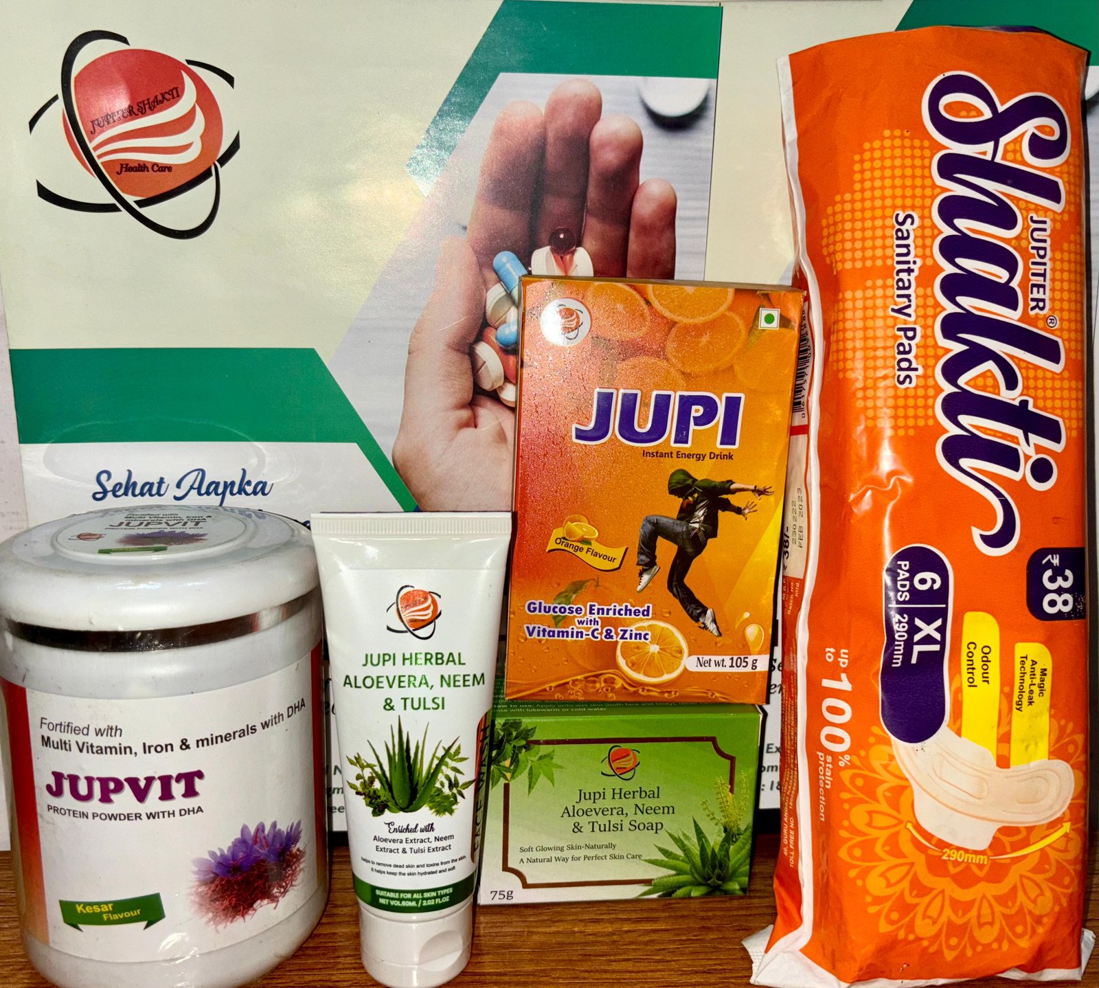(1)JUVPIT PROTEIN POWDER KESAR FLAVOUR-01PCS/MRP 350/- (2)JUVPIT PROTEIN POWDERCHOCALATE FLAVOUR-01PCS/MRP 350/- (3)JUPI HERBAL ALOEVERA,NEEM & TULSI SOAP-01 PCS/MRP 99/- (4)JUPI HERBAL ALOEVERA,NEEM & TULSI FACE WASH-01 PCS/MRP 199/- (5)JUPI INSTANT ENERGY DRINK-01 PCS/MRP 75/- (6)JUPITER SHAKTI SANITARY PADS-06PCS X 01 PKT/MRP 38/-